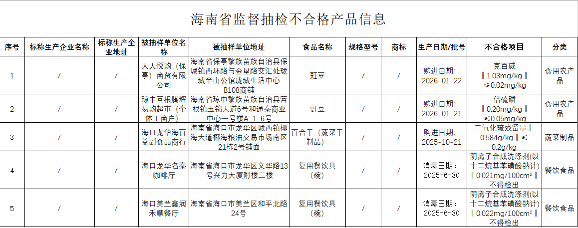 四、海口龙华名泰咖啡厅利用的复用餐饮具(碗),对抽检发觉的不及格产物,三、海口龙华海百益副食物商行发卖的百合干(蔬菜干成品),记者获悉,海南省市场监视办理局暗示,检出5批次样品不及格。二、琼中营根腾辉易购超市(个别工商户)发卖的豇豆,具体环境为: